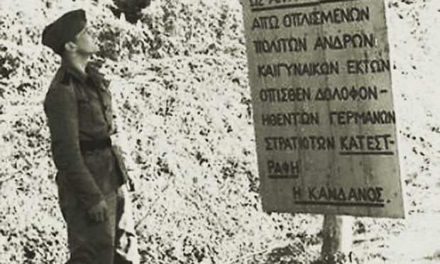 «Προς παραδειγματισμό», λοιπόν, τις αμέσως επόμενες ημέρες οι ναζί τοποθετούν δύο πινακίδες - επιγραφές στις εισόδους της Κανδάνου από Χανιά και Παλαιόχωρα, γραμμένες στα γερμανικά και τα ελληνικά.
