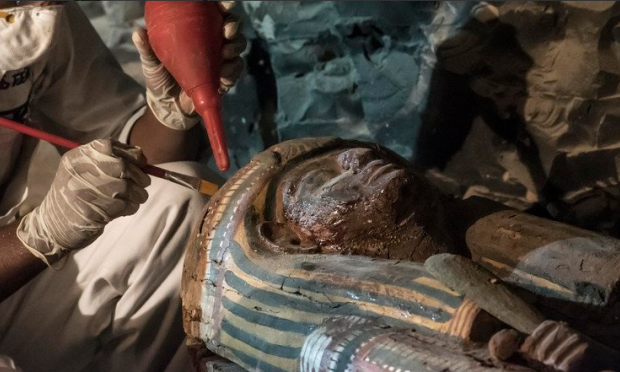 Οι αρχαιολόγοι βρήκαν μέσα στο ξύλινο κιβώτιο μια μούμια σε πολύ καλή κατάσταση, τυλιγμένη σε λινό ύφασμα, με το πρόσωπο καλυμένο με μια μάσκα ζωγραφισμένη με γαλάζιο και χρυσό χρώμα. Ο υφυπουργός Μοχάμεντ Άμπντελ Λατίφ διευκρίνισε ότι οι επιστήμονες προχώρησαν σε μια πρώτη "αποκατάσταση" τόσο της μούμιας όσο και της σαρκοφάγου, επειδή η τελευταία ήταν σε πολύ κακή κατάσταση.