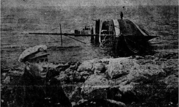 Οι τρεις αξιωματικοί γέφυρας του «Πόπη» πάνω στο ξερονήσι που έριξαν το καράβι, αναμένουν να τους πάρουν για τον Πειραιά. Πίσω τους στοιβαγμένα κεφάλια από τυριά που φρόντισαν οι άνδρες του πληρώματος να βγάλουν την ίδια στιγμή που οι επιβάτες πνίγονταν!