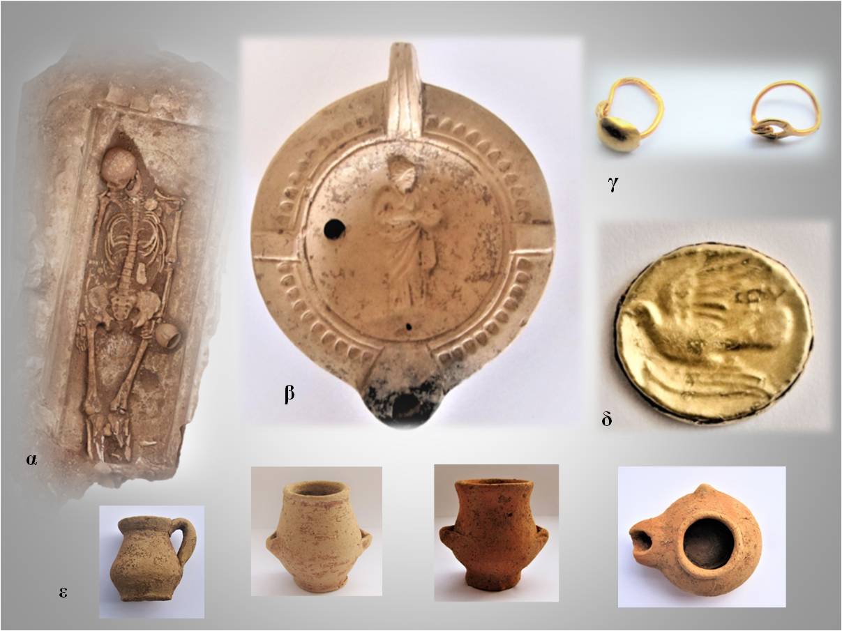 1α: Ταφή ελληνιστικών χρόνων. 1β: Λύχνος ρωμαϊκών χρόνων με παράσταση Υγείας. 1γ:Χρυσά ενώτια ρωμαϊκών χρόνων. 1δ:Χρυσή δανάκη Σικυώνας. 1ε: Μικκύλα αγγεία ελληνιστικών χρόνων.