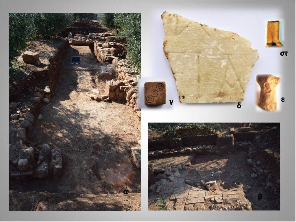 Λεπτομέρειες και ευρήματα από τον ανεσκαμμένο χώρο με τα οικιστικά κατάλοιπα. 5α και β: Λεπτομέρειες του ανεσκαμμένου χώρου όπου διακρίνονται θυραία ανοίγματα και πήλινα δάπεδα. 5γ: Οστέινο ζάρι ρωμαϊκών χρόνων. 5δ:Απότμημα μαρμάρινης επιγραφής ρωμαϊκών χρόνων. 5ε: Ειδώλιο ζώου. 5 στ: τμήμα ειδωλίου.