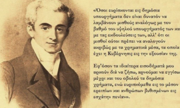 «Θα σας φανερώσω ένα πολιτικό μυστικό, που αργά ή γρήγορα δυστυχώς θα πραγματοποιηθεί: Ο Καποδίστριας δεν θα μπορέσει να κρατηθεί για μακρό χρονικό διάστημα στην διοίκηση των ελληνικών πραγμάτων, γιατί δεν διαθέτει την απαραίτητη γι’ αυτές τις καταστάσεις ιδιότητα: Δεν είναι στρατιωτικός. Δεν έχουμε κανένα παράδειγμα, κατά το οποίο άνθρωπος του γραφείου και του πνεύματος να μπορέσει να διοικήσει ένα επαναστατημένο κράτος και να υποτάξει σε νόμους στρατιωτικούς και στρατηγούς και κοτζαμπάσηδες. Με το σπαθί στο χέρι, και ως αρχηγός του στρατού, μπορείς να διατάσσεις, να νομοθετείς και να επιβάλλεις τήρηση των νόμων, οπότε μπορείς να είσαι βέβαιος ότι θα σε υπακούσουν και θα πειθαρχήσουν. Χωρίς όμως την στρατιωτική σπάθη είναι αμφίβολη η επιτυχία … Και ο Καποδίστριας δεν κρατάει σπαθί … Σας το προλέγω … Δεν είναι δυνατόν να γίνει διαφορετικά …»