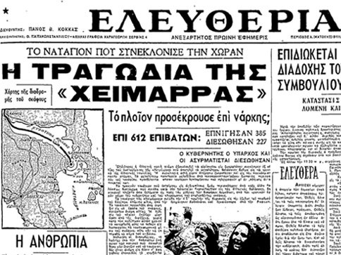 Στη 1 τα ξημερώματα της Κυριακής φθάσαμε στη Χαλκίδα και σε λίγο το "Χειμάρρα" απέπλευσε. Μετά από λίγες ώρες το πλοίο συγκλονίστηκε από μια τρομερή έκρηξη. Επακολούθησε πανικός. Δε λειτουργούσε τίποτε. Επικράτησε απόλυτο σκοτάδι. Το "Χειμάρρα" ήταν ακυβέρνητο. Όλοι οι πολιτικοί εξόριστοι είχαμε συγκεντρωθεί στο κατάστρωμα. Ένας σύντροφός μου, ο Αριστείδης, είχε μία λάμπα θυέλλης και την άναψε. Ο Παναγιώτης ο Τάρπογλου έρχεται και μας λέει ότι τα αμπάρια γεμίσανε νερό. Από ένα κιβώτιο παίρνουμε σωσίβια. Βγάζω τα ρούχα μου, το φοράω και ζητάω από τους άλλους συγκρατούμενούς μου να κάνουν το ίδιο.