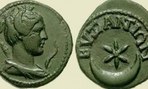 Στον 5ο αιώνα μ.Χ. σε νόμισμα του αυτοκράτορα Αναστασίου Ι (491-518 μ.Χ.), βρίσκουμε νόμισμα που στη μια μεριά έχει την προτομή του αυτοκράτορα και στην άλλη την ημισέληνο. Στη συνέχεια και για πολλούς αιώνες συναντούμε την ημισέληνο με πολλούς τρόπους σε απεικονίσεις στο Βυζάντιο.