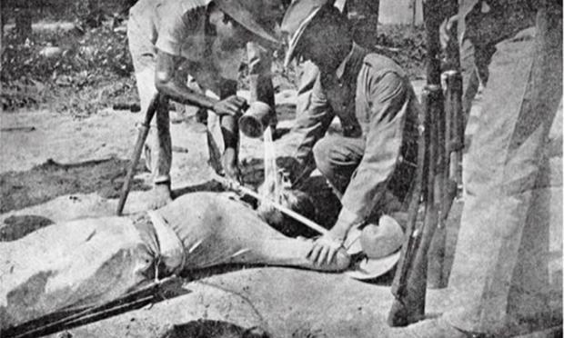 Ένα ακόμη πιο εξελιγμένο βασανιστήριο με νερό ήταν στην κυριολεξία το γέμισμα του στομαχιού και των εντοσθίων του ανθρώπινου σώματος με νερό. Οι βασανιστές με μια αντλία έβαζαν νερό από το στόμα του θύματος.Όταν ο κρατούμενος έφτανε σε σημείο πνιγμού, σταμάταγαν για λίγο την τυραννική διαδικασία και άρχιζαν τις ανακρίσεις.Ο πόνος ήταν αφόρητος καθώς εντόσθια και στομάχι επιμηκύνονταν με βία για να χωρέσουν μεγάλες ποσότητες νερού.