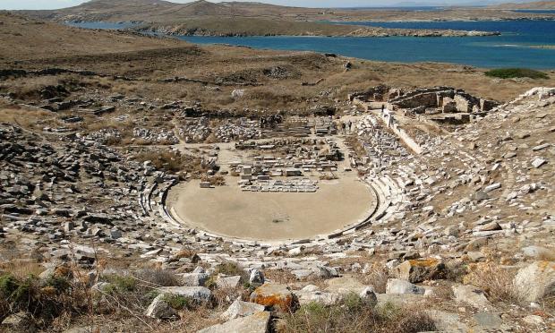 Σχετικά με το αρχαίο θέατρο της Δήλου, η λίθινη κατασκευή φτιάχτηκε τον 3ο αιώνα π.Χ. και μπορούσε να φιλοξενήσει μέχρι και 6.500 θεατές. Στο αρχαίο θέατρο διοργανώνονταν αγώνες στο πλαίσιο των Δηλίων, ενώ η ανασκαφή του μνημείου ξεκίνησε στα τέλη του 19ου αιώνα από τη Γαλλική Αρχαιολογική Σχολή. Παρόλο που μεγάλη ποσότητα μαρμάρου μεταφέρθηκε σε γειτονικά νησιά για να χρησιμοποιηθεί ως οικοδομικό υλικό, στο εσωτερικό και τον περιβάλλοντα χώρο του θεάτρου καταγράφηκαν 4.000 αρχιτεκτονικά μέλη συνολικού βάρους 30 τόνων.