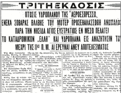 Αντίστοιχη με την παραπάνω, αλλά με λιγότερο μυστήριο, είναι η θαλάσσια τραγωδία που συνέβη δώδεκα χρόνια μετά, το 1929. Οσο και αν φαίνεται παράξενο, αφού βρισκόμαστε στα πρώιμα χρόνια της αεροπλοΐας, τότε υπάρχουν στη χώρα μας υδροπλάνα που εκτελούν κάποιες εναέριες μεταφορές. Ανήμερα τα Χριστούγεννα το υδροπλάνο της εταιρίας Αεροεσπρέσο που εκτελεί την πτήση Κωνσταντινούπολη-Αθήνα εκπέμπει σήμα κινδύνου και τελικά πέφτει κοντά στο νησί του Αη Στράτη. Οι έρευνες για την εύρεση του υδροπλάνου και του εξαμελούς πληρώματος στις οποίες συμμετέχουν το καταδρομικό «Ελλη», δυο ιταλικά αντιτορπιλικά που βρίσκονται στην περιοχή και άλλα υδροπλάνα, αποβαίνουν άκαρπες, και σταματούν μετά από λίγες ημέρες χωρίς να βρεθούν ποτέ ούτε τα συντρίμμια ούτε οι σωροί του πληρώματος.