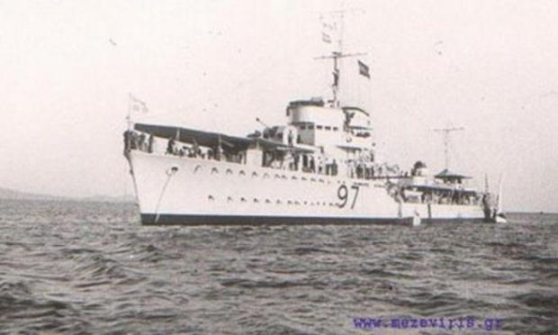 Το αντιτορπιλικό “ΒΑΣΙΛΕΥΣ ΓΕΩΡΓΙΟΣ”, στο οποίο επέβαινε ο Πλοίαρχος Μεζεβίρης ως Ανώτερος Διοικητής αντιτορπιλικών, πλήττεται από αεροσκάφος καθέτου εφορμήσεως και πληγωμένο οδηγείται στο Ναύσταθμο για δεξαμενισμό.