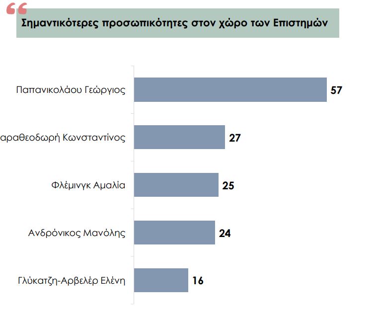 Τέλος, στον χώρο των Επιστημών, ξεχωρίζει ο Γεώργιος Παπανικολάου, απολαμβάνοντας τη στήριξη όλων των δημογραφικών κατηγοριών, ενώ ο ακολουθούν ο Κωνσταντίνος Καραθεοδωρή και ο Μανόλης Ανδρόνικος, κυρίως λόγω της στήριξης τους από πολίτες μεγαλύτερης ηλικίας.