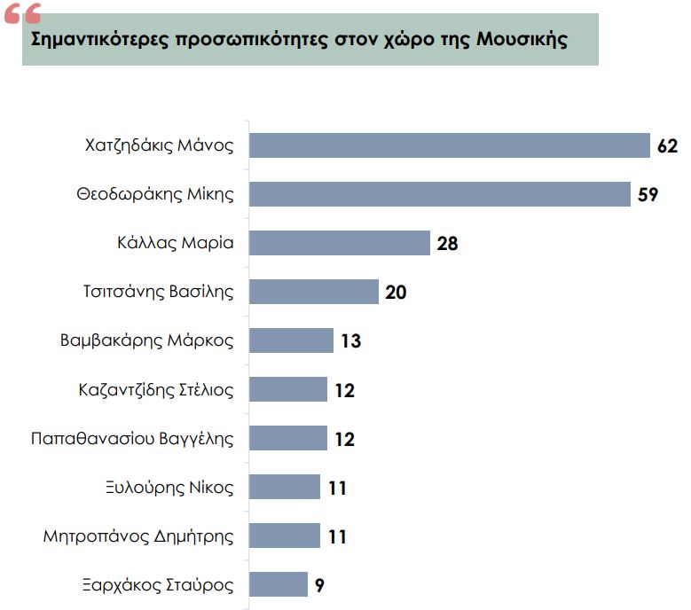 Ο Μάνος Χατζιδάκις και ο Μίκης Θεοδωράκης αναδεικνύονται ως οι δύο σημαντικότερες προσωπικότητες στον χώρο της Μουσικής, ενώ η Μαρία Κάλλας εισέρχεται στην πρώτη 5άδα κυρίως λόγω της στήριξης της από πολίτες που τοποθετούνται πολιτικά στο κέντρο και τα δεξιά του πολιτικού φάσματος.