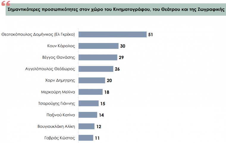 Ο Δομήνικος Θεοτοκόπουλος καταγράφεται με μεγάλη διαφορά ως ο σημαντικότερος Έλληνας της νεότερης Ελλάδας στον χώρο του Κινηματογράφου, της Ζωγραφικής και του Θεάτρου, ενώ ο Θόδωρος Αγγελόπουλος εμφανίζεται στην πρώτη 5άδα κυρίως λόγω της εξαιρετικής δημοφιλίας του μεταξύ των αριστερών πολιτών. Τέλος, ο Κάρολος Κουν επίσης εισέρχεται στην 5άδα, καθώς επιλέχθηκε από μεγάλη μερίδα μεγαλύτερων ηλικιακά πολιτών.