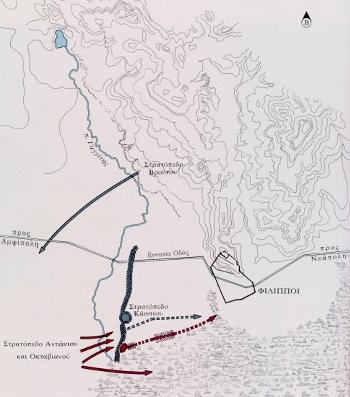 Μετά τη δολοφονία του Ιουλίου Καίσαρα στη Ρώμη (15 Μαρτίου 44 π.Χ.), οι επικεφαλής της «δημοκρατικής» συνωμοσίας Κάσσιος και Βρούτος διέφυγαν στις ανατολικές επαρχίες, όπου κατείχον πολιτικοστρατιωτικές θέσεις, ο μεν Κάσιος στη Συρία, ο δε Βρούτος στη Μακεδονία. Αφού έγιναν κύριοι της κατάστασης στις επαρχίες τους, ένωσαν τις δυνάμεις τους για να αντιμετωπίσουν το στρατό των υποστηρικτών του δολοφονηθέντος ηγέτη.