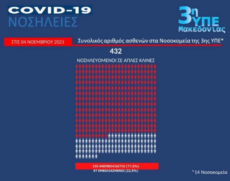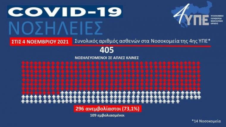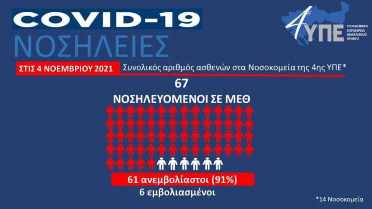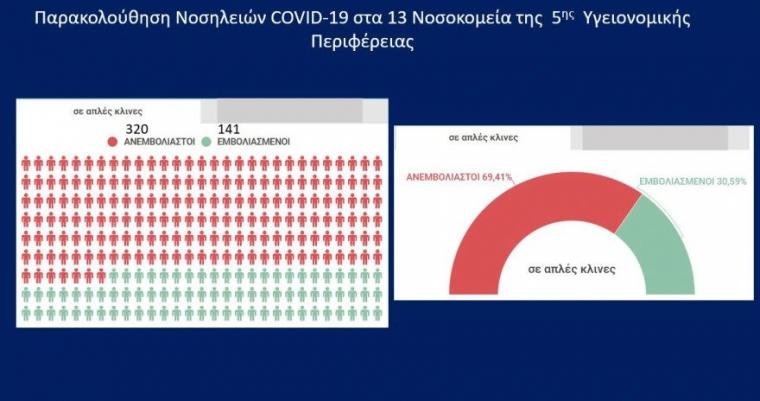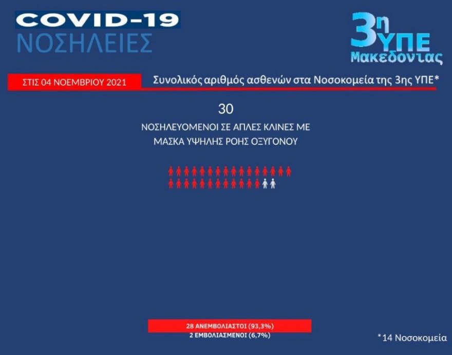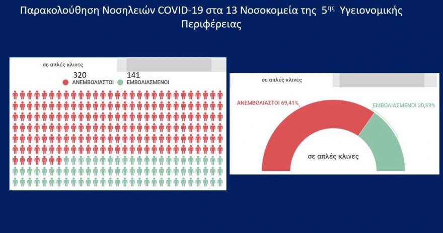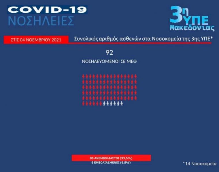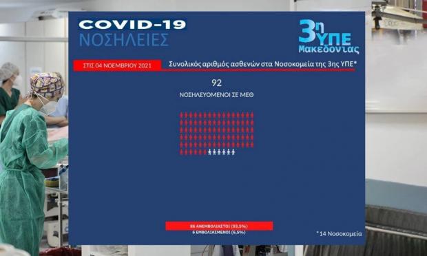 Όπως ανέφερε η κυρία Γκάγκα, σε ΜΕΘ της 3ης ΥΠΕ νοσηλεύονται 92 ασθενείς, το 93% εκ των οποίων ανεμβολίαστοι, ενώ σε θαλάμους με υψηλή ροή οξυγόνου νοσηλεύονται 30 ασθενείς -στην πλειοψηφία τους ανεμβολίαστοι- και σε κοινούς θαλάμους 432 ασθενείς, το 77% των οποίων ανεμβολίαστοι. Αντίστοιχα, στην 4η ΥΠΕ, νοσηλεύονται σε ΜΕΘ 67 ασθενείς (το 91% ανεμβολίαστοι) και σε κοινούς θαλάμους 405 (το 73% ανεμβολίαστοι). Τέλος, στην 5η ΥΠΕ, το 69% των ασθενών σε κοινούς θαλάμους είναι ανεμβολίαστοι.