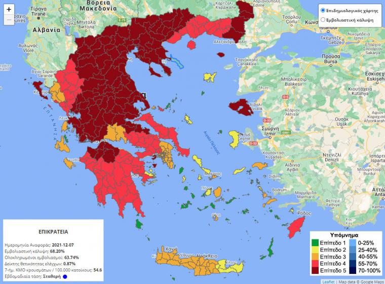 Την άσχημη επιδημιολογική εικόνα της χώρας αποτυπώνει και ο χάρτης που δόθηκε στη δημοσιότητα από το covid19.gov.gr.
