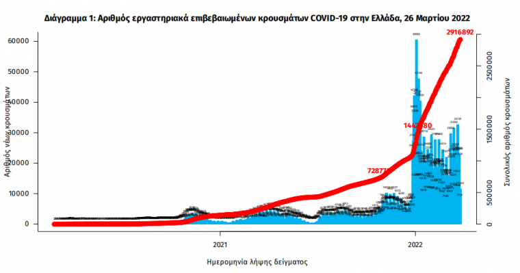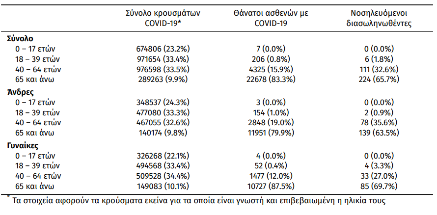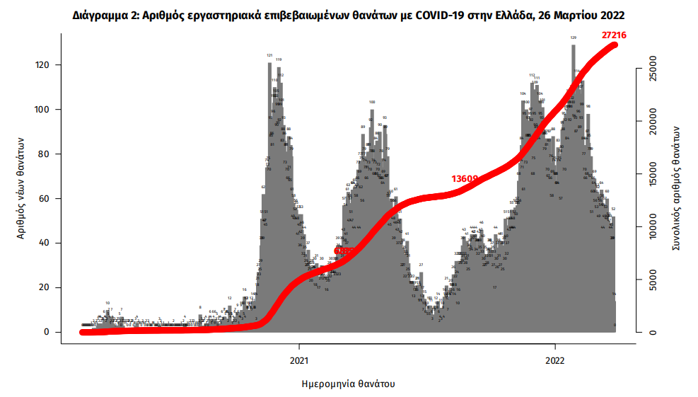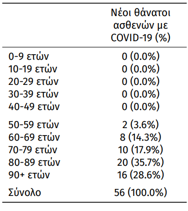 Οι νέοι θάνατοι ασθενών με COVID-19 είναι 56, ενώ από την έναρξη της επιδημίας έχουν καταγραφεί συνολικά 27.216 θάνατοι. Το 95.3% είχε υποκείμενο νόσημα ή/και ηλικία 70 ετών και άνω.