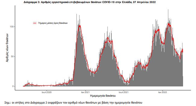 Οι νέοι θάνατοι ασθενών με COVID-19 είναι 76, ενώ από την έναρξη της επιδημίας έχουν καταγραφεί συνολικά 27.968 θάνατοι. Το 95.4% είχε υποκείμενο νόσημα ή/και ηλικία 70 ετών και άνω. Στο Διάγραμμα 3 παρουσιάζεται η ημερήσια κατανομή των θανάτων και ο 7ήμερος κυλιόμενος μέσος όρος του αριθμού των θανάτων.