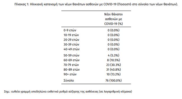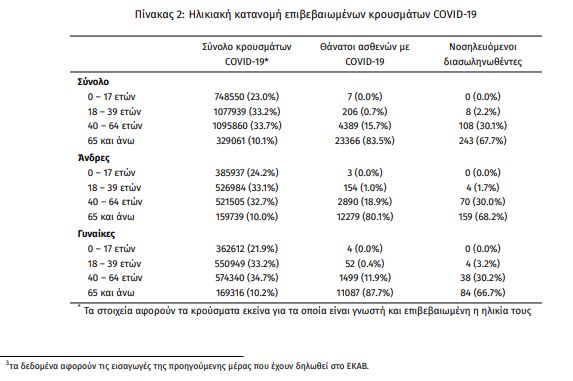 Οι εισαγωγές νέων ασθενών COVID-19 στα νοσοκομεία της επικράτειας είναι 382 (ημερήσια μεταβολή -3.05%). Ο μέσος όρος εισαγωγών του επταημέρου είναι 404 ασθενείς.Η διάμεση ηλικία των κρουσμάτων είναι 36 έτη (εύρος 0.2 έως 112 έτη), ενώ η διάμεση ηλικία των θανόντων είναι 79 έτη (εύρος 0.2 έως 106 έτη).
