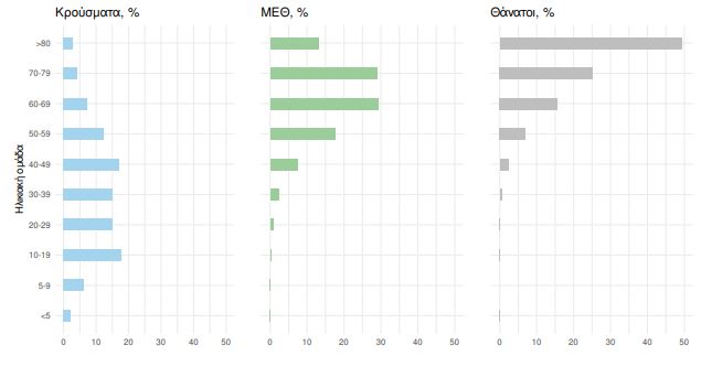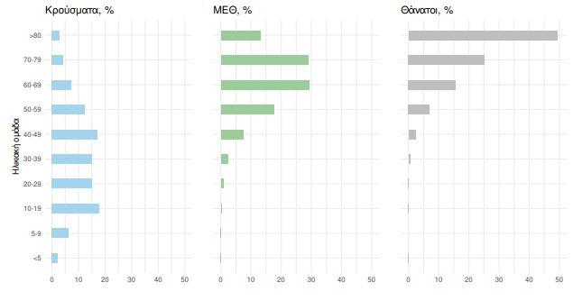 Ακολούθως παρουσιάζεται η ηλικιακή κατανομή των (α) συνολικών κρουσμάτων, (β) των περιστατικών που κατέληξαν σε θάνατο και (γ) των ασθενών που νοσηλεύονται διασωληνωμένοι: