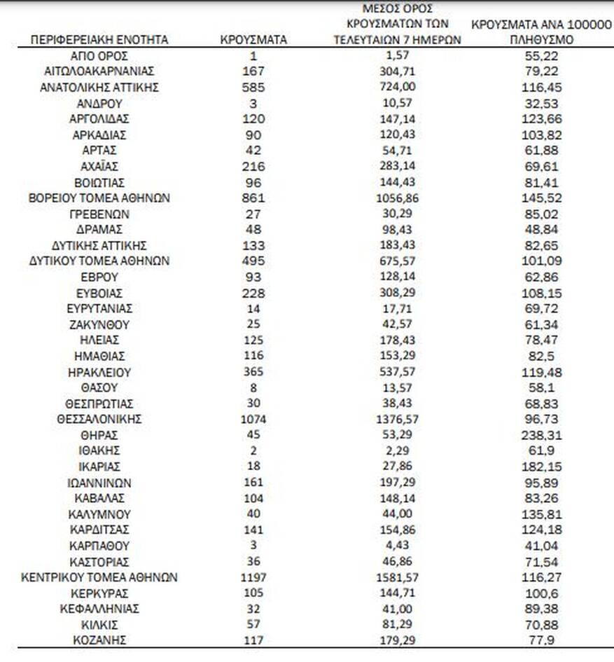 Κατανομή ανακοινωθέντων εγχώριων κρουσμάτων: Από το σύνολο των 11.058 νέων κρουσμάτων του νέου ιού στη χώρα 1 είναι εισαγόμενo. Η κατανομή των 11.057 νέων εγχώριων κρουσμάτων ανά Περιφερειακή Ενότητα παρουσιάζεται στον κατωτέρω πίνακα.
