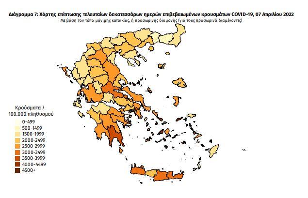 Γεωγραφική διασπορά: Ο χάρτης αποτυπώνει τη γεωγραφική κατανομή των κρουσμάτων COVID-19 των τελευταίων 14 ημερών ανά Περιφερειακή Ενότητα της χώρας, με βάση την δηλωθείσα διεύθυνση μόνιμης κατοικίας του ασθενούς, ή τη διεύθυνση προσωρινής διαμονής για τους τουρίστες και άλλους προσωρινά διαμένοντες στην Ελλάδα. Συμπεριλαμβάνονται τόσο κρούσματα με ιστορικό ταξιδιού (“εισαγόμενα”) όσο και κρούσματα με πιθανή εγχώρια μετάδοση.