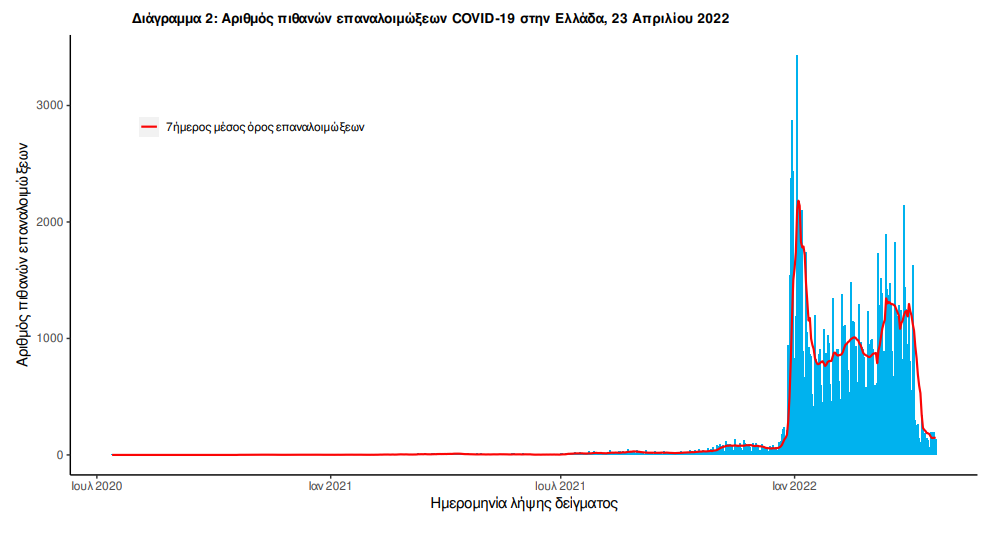 Ο αριθμός πιθανών νέων επαναλοιμώξεων που καταγράφηκαν τις τελευταίες 24 ώρες ήταν 149 ενώ από την αρχή της πανδημίας SARS-CoV-2 ο συνολικός αριθμός εκτιμάται σε 121.135(3.6% του συνολικού αριθμού των θετικών αποτελεσμάτων).