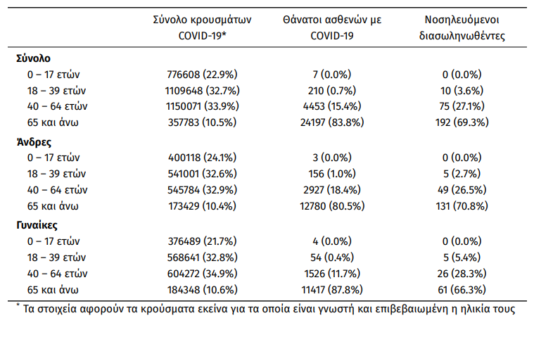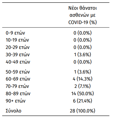 Οι νέοι θάνατοι ασθενών με COVID-19 είναι 28, ενώ από την έναρξη της επιδημίας έχουν καταγραφεί συνολικά 28.867 θάνατοι. Το 95.5% είχε υποκείμενο νόσημα ή/και ηλικία 70 ετών και άνω.
