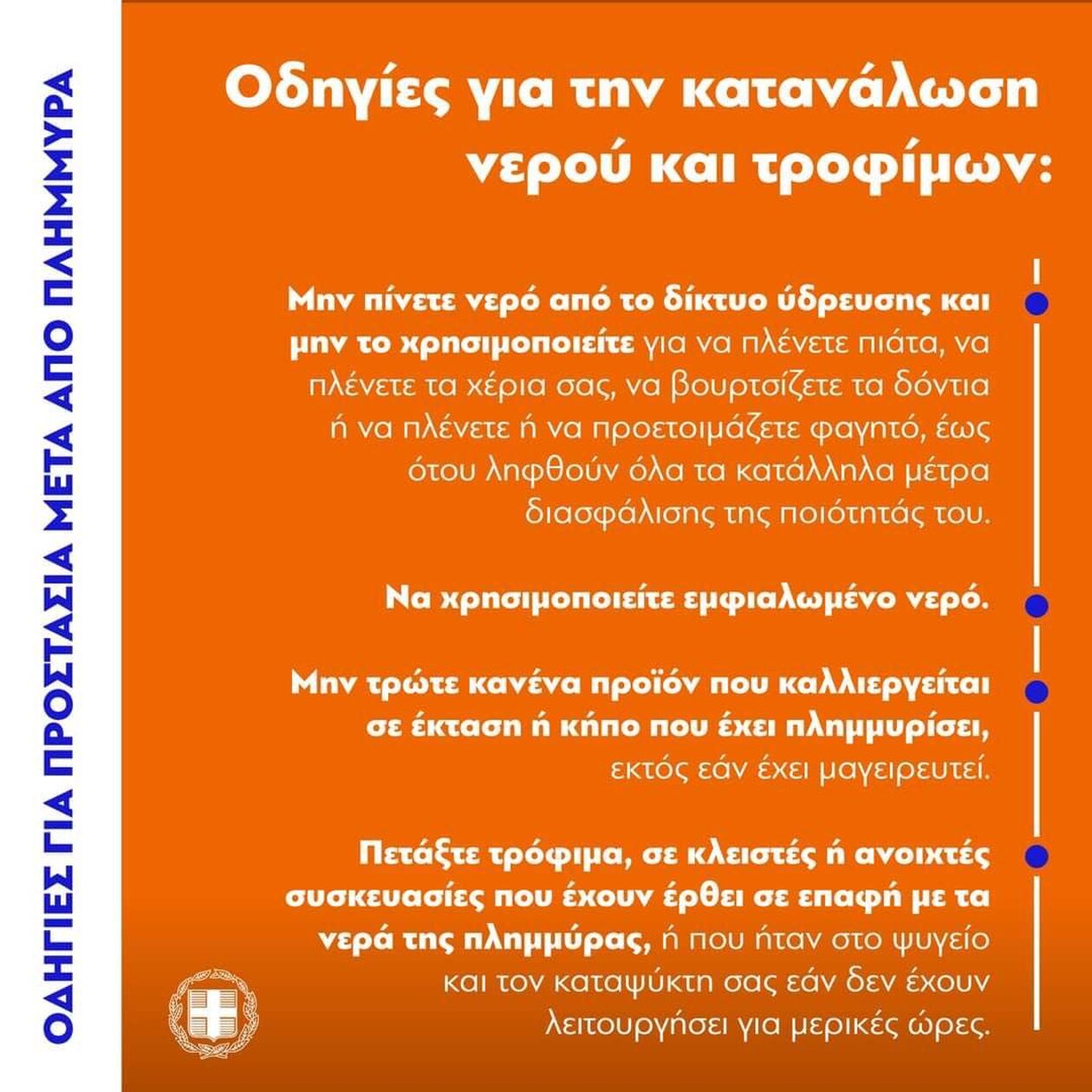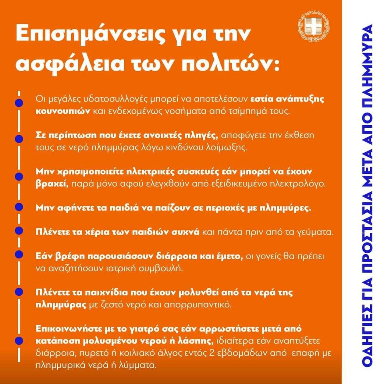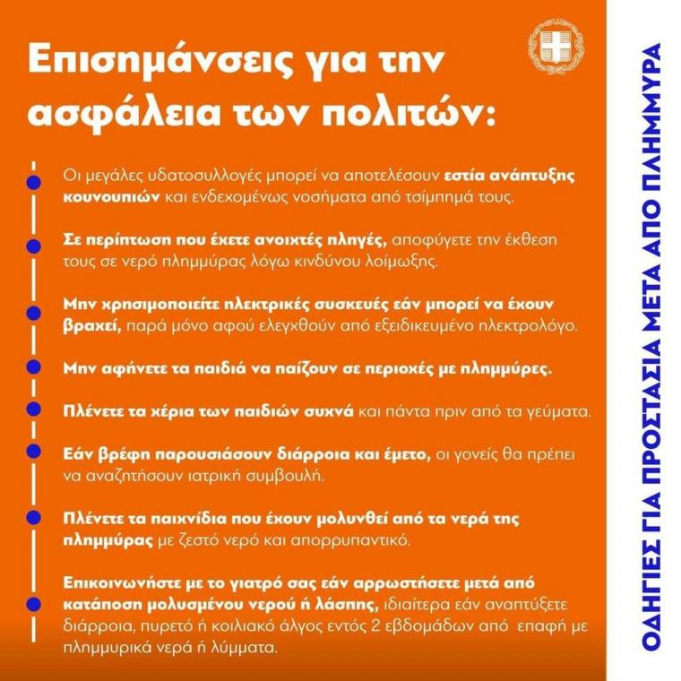 Είναι σημαντικό να γνωρίζουν οι πολίτες ότι σε όλες τις πληγείσες περιοχές διενεργούνται έλεγχοι από το αρμόδιο εργαστήριο Δημόσιας Υγείας του Πανεπιστημίου Θεσσαλίας σε σχέση με την ποιότητα του νερού και οι κατά τόπους αρχές ανακοινώνουν πότε είναι ασφαλές να έχουν οι πολίτες πρόσβαση και να δώσουν στην κυκλοφορία το δίκτυο υδροδότησης.