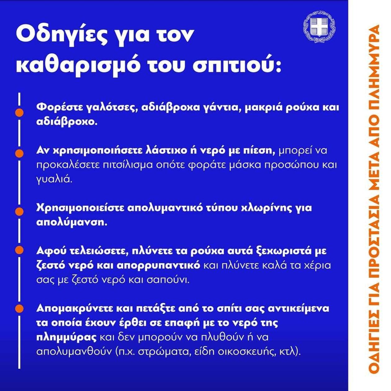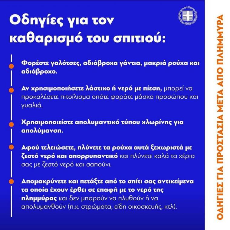Εξίσου σημαντικό είναι όταν οι πολίτες επιχειρούν να προσεγγίσουν τα σπίτια τους για να ξεκινήσουν οι εργασίες αποκατάστασης, να έχουν κατά νου ότι ενδεχομένως νεκρά ζώα, όπως τρωκτικά, ερπετά ή και κατοικίδια τα οποία, δυστυχώς, παρασύρθηκαν από την πλημμύρα και είναι νεκρά, μπορεί να βρίσκονται μέσα στα σπίτια τους μαζί με άλλα φερτά υλικά.
