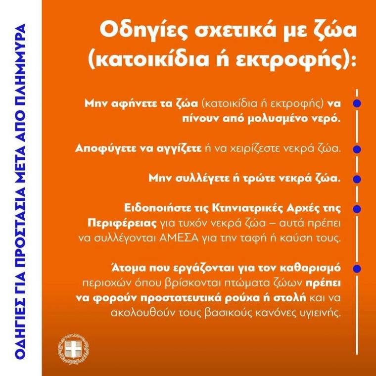 Σε σχέση με αυτό οι πολίτες που εντοπίζουν νεκρά ζώα που έχουν παρασυρθεί από τις πλημμύρες στις διάφορες περιοχές είναι σημαντικό να ειδοποιούν την Περιφέρεια, τους δήμους, τις αρμόδιες υπηρεσίες προκειμένου να γίνεται άμεσα η συλλογή των ζώων και να προχωρήσουμε στις διαδικασίες καύσης και ταφής.