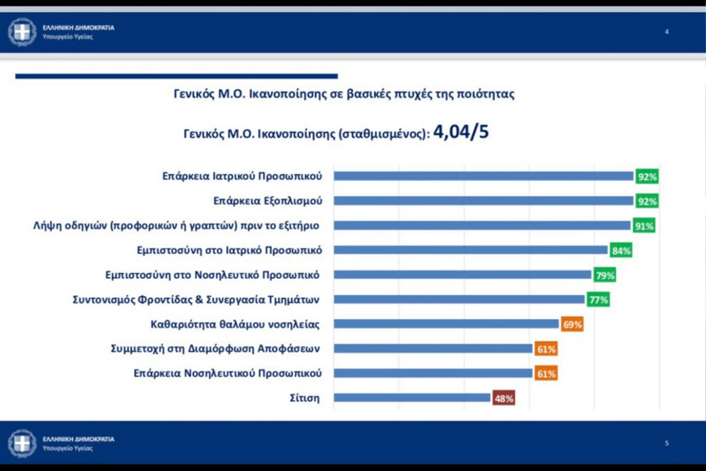 Σε όλα αυτά ο δείκτης ικανοποίησης είναι χαμηλότερος σε αντίθεση με την επάρκεια ιατρικού προσωπικού και εξοπλισμού, την λήψη ικανοποιητικών οδηγιών πριν από το εξιτήριο, την εμπιστοσύνη σε γιατρούς και νοσηλευτές καθώς και την διαχείριση και τον συντονισμό μεταξύ των τμημάτων του νοσοκομείου, όπου και καταγράφεται υψηλός δείκτης ικανοποίησης.