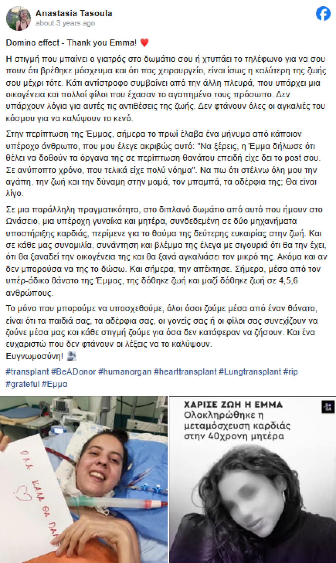 Η Αναστασία είχε αποκαλύψει πως η Έμμα Καρυωτάκη, η 21χρονη που είχε σκοτωθεί σε τροχαίο στη Θεσσαλονίκη, είχε αποφασίσει να δωρίσει τα όργανά της μετά την ανάρτηση που είχε κάνει η ίδια.  Έγραφε τότε η Αναστασία:
