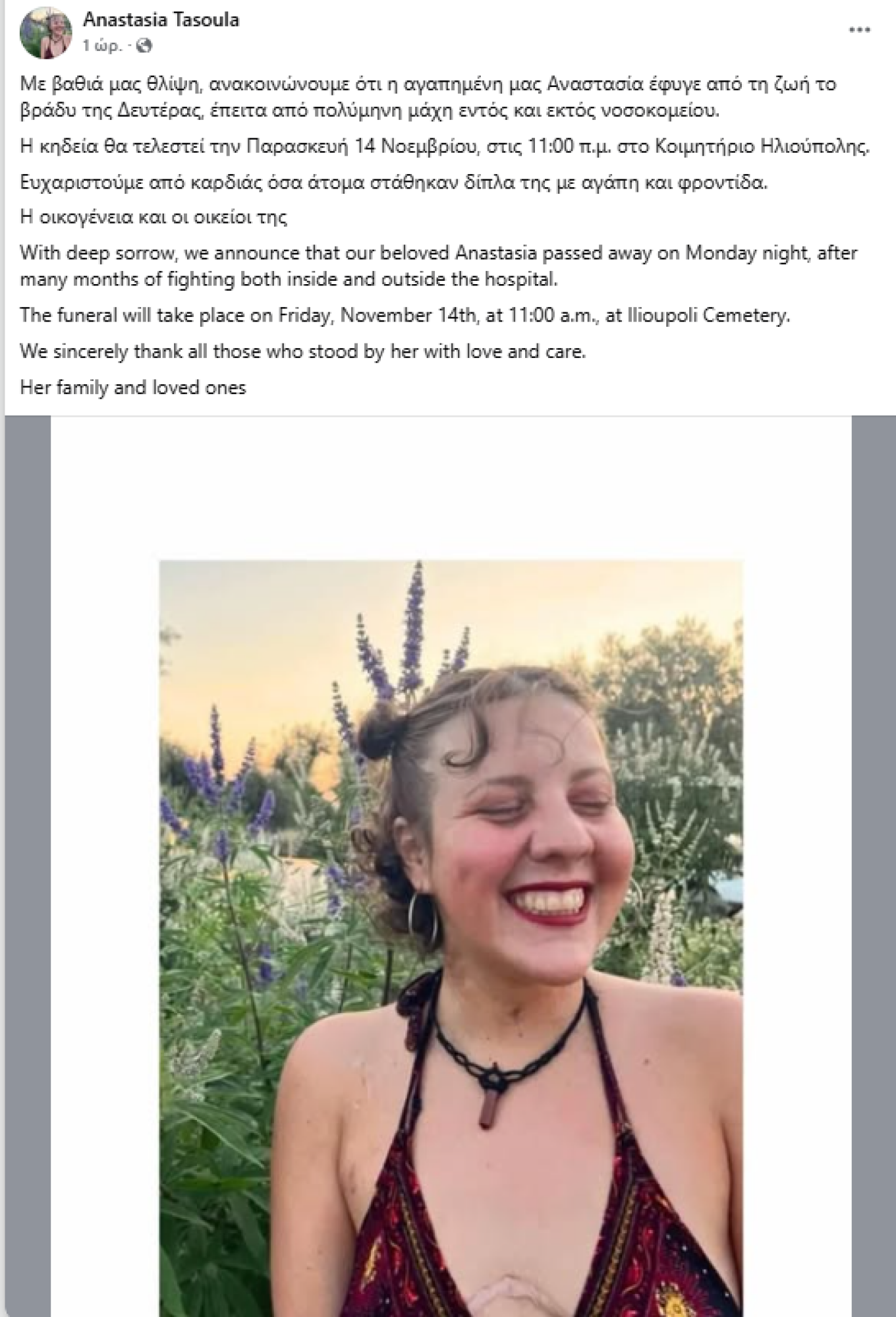 «Με βαθιά μας θλίψη, ανακοινώνουμε ότι η αγαπημένη μας Αναστασία έφυγε από τη ζωή το βράδυ της Δευτέρας, έπειτα από πολύμηνη μάχη εντός και εκτός νοσοκομείου. Η κηδεία θα τελεστεί την Παρασκευή 14 Νοεμβρίου, στις 11:00 π.μ. στο Κοιμητήριο Ηλιούπολης. Ευχαριστούμε από καρδιάς όσα άτομα στάθηκαν δίπλα της με αγάπη και φροντίδα», ανακοίνωσε η οικογένεια της Αναστασίας στα social media.