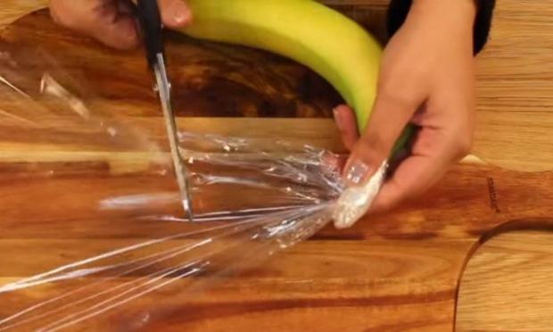 Υπάρχει όμως και μια άλλη μέθοδος, η οποία σας εξασφαλίζει ότι οι μπανάνες δεν θα μαυρίσουν γρήγορα. Μόλις τις αγοράσετε (όχι τελείως ώριμες) το πρώτο που πρέπει να κάνετε είναι να τις ξεχωρίσετε μία-προς-μία από το τσαμπί. Στην συνέχεια πάρτε την απλή πλαστική μεμβράνη που πιθανότατα έχετε στην κουζίνα σας και τυλίξτε καλά το κοτσάνι της κάθε μπανάνας, όπως στο βίντεο που ακολουθεί.