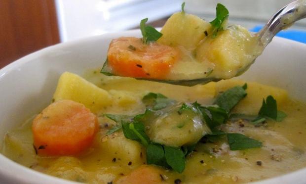 Οδηγίες: Μην ξεφλουδίσετε τα υλικά, αλλά πλύνετε και τρίψτε τα απαλά. Κόψτε τα σε χοντρά κομμάτια και βάλτε τα σε μη τοξικό μαγειρικό σκεύος. Προσθέστε φιλτραρισμένο νερό για να καλύψετε τα λαχανικά, σιγοβράστε το για 2 ώρες μέχρι να μαλακώσουν τα λαχανικά. Βάλτε τα μαγειρεμένα λαχανικά σε μύλο ή μπλέντερ μέχρι να πάρουν μαλακή υφή. Κάντε το αυτό όσο η σούπα είναι ζεστή, αλλά όχι καυτή.