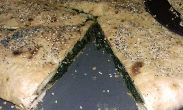 - Κάνουμε με τον ίδιο τρόπο τα άλλα τρία φύλλα και τα βάζουμε πάνω στη γέμιση. Γυρίζουμε τα φύλλα που προεξέχουν, αφού έχουν μαραθεί, προς τα μέσα. Θα πρέπει να γίνει μια κυκλική όμορφη πίτα.
