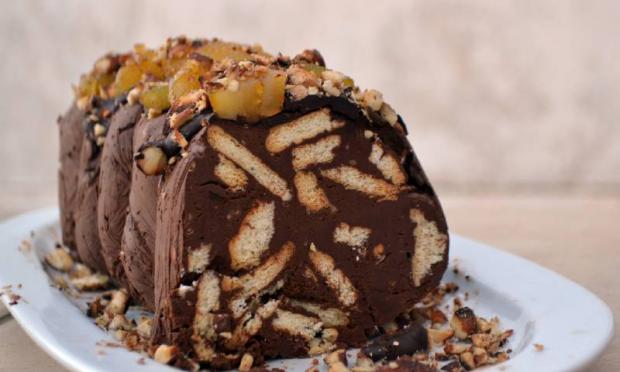 Βάζουμε το μωσαϊκό σε μια λαδόκολλα ή σε μία μεμβράνη και ρολάρουμε δίνοντας το σχήμα του κορμού. Βάζουμε στο ψυγείο να παγώσει και να σφίξει για περίπου 2 ώρες ώσπου να κόβεται.