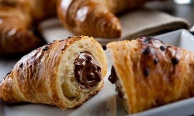 Το ρολλάρουμε προσέχοντας το τελείωμα της ζύμης να είναι στο κάτω μέρος του κρουασάν και το μεταφέρουμε σε ένα ταψί φούρνου στο οποίο έχουμε στρώσει λαδόκολλα.