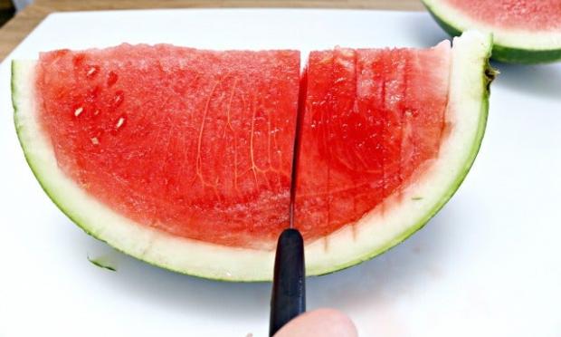 Μόλις τελειώσετε τον τεμαχισμό, μπορείτε να παίρνετε ένα-ένα τα τετράγωνα κομμάτια, κρατώντας τα από την βάση και απολαμβάνοντας χωρίς μπελάδες το φρούτο που είναι ο αδιαμφισβήτητος βασιλιάς του καλοκαιριού!