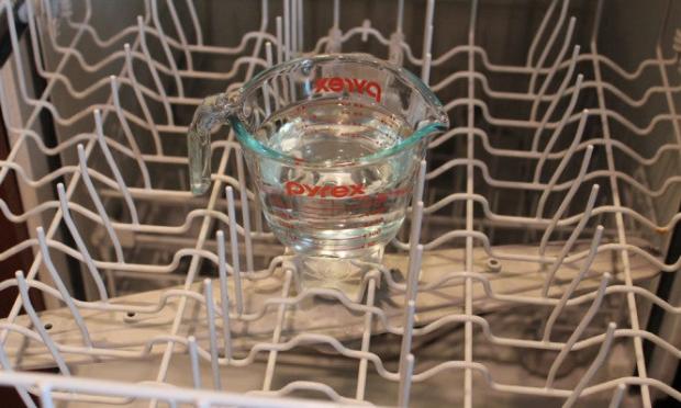 2. Τοποθετήστε ένα μπολ ή άλλο δοχείο στο επάνω ράφι. Γεμίστε το με λευκό ξύδι. Μην βάλετε τίποτα άλλο μέσα, κλείστε την πόρτα και βάλτε το άδειο πλυντήριο πιάτων να εκτελέσει έναν πλήρη κύκλο πλυσίματος στην ρύθμιση με το πιο καυτό νερό.