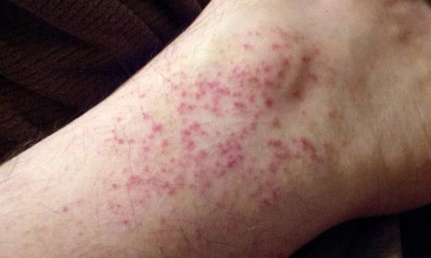 Το εξάνθημα αποτελείται από μικροσκοπικές κηλίδες, ή ανωμαλίες, που περιβάλλονται από μια περιοχή κόκκινου δέρματος. Οι κηλίδες μερικές φορές μοιάζουν με μικρές φουσκάλες και μπορεί να προκαλέσουν: