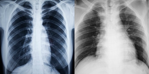 Εδώ βλέπετε την ακτινογραφία ενός ατόμου που δεν καπνίζει και έχει υγιείς πνεύμονες (αριστερά) και την αντίστοιχη ακτινογραφία ενός ατόμου που είναι χρόνιος καπνιστής και έχει κατεστραμμένους πνεύμονες (δεξιά).